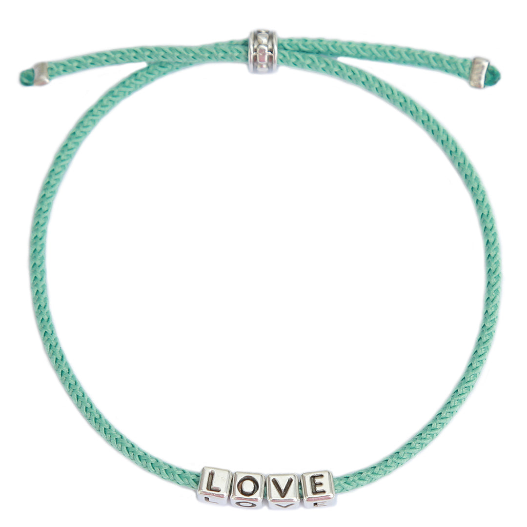 Schönes handgefertigtes Armband mit silbernen LOVE-Anhängern und türkisfarbener Kordel.