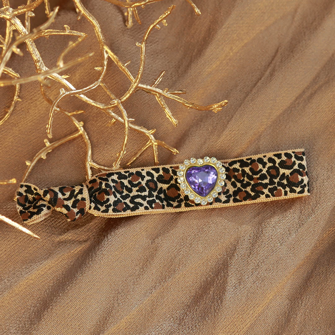 Cute leopard bracelet with a rhinestone heart charm in a purple color.
