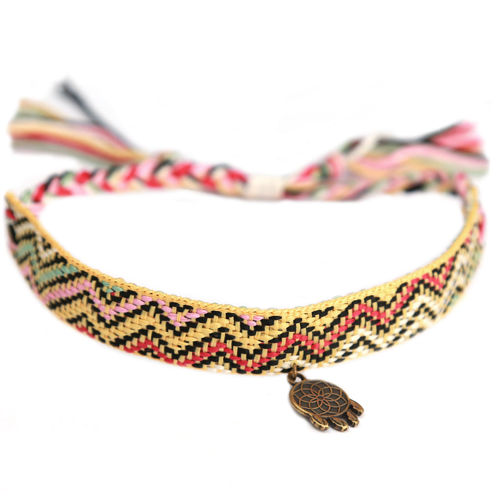 Jolie chaîne de cheville tissée colorée avec un pendentif attrape-rêves en bronze.