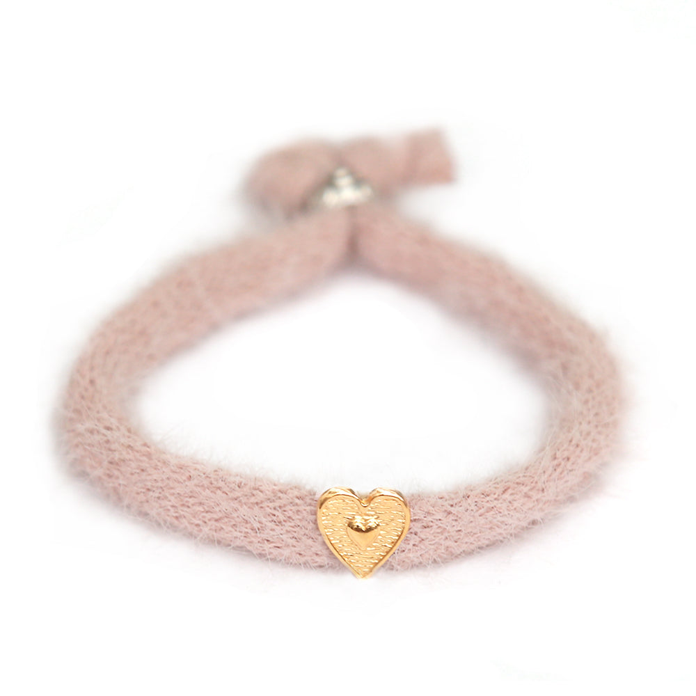 Leuke oud roze fluffy armband met een hartjes bedel en schuifkraal. Materiaal: gebreid elastisch koord, gold plated...