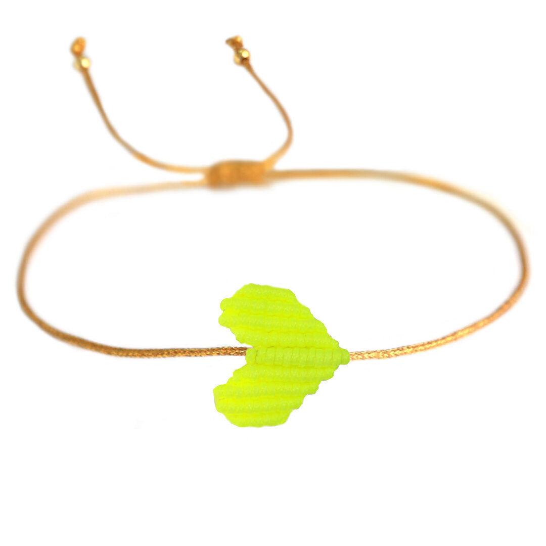 Fijn armbandje van gouden koord met een gevlochten hartje. Het armbandje is gemakkelijk op maat te schuiven met het schuifknoopje.