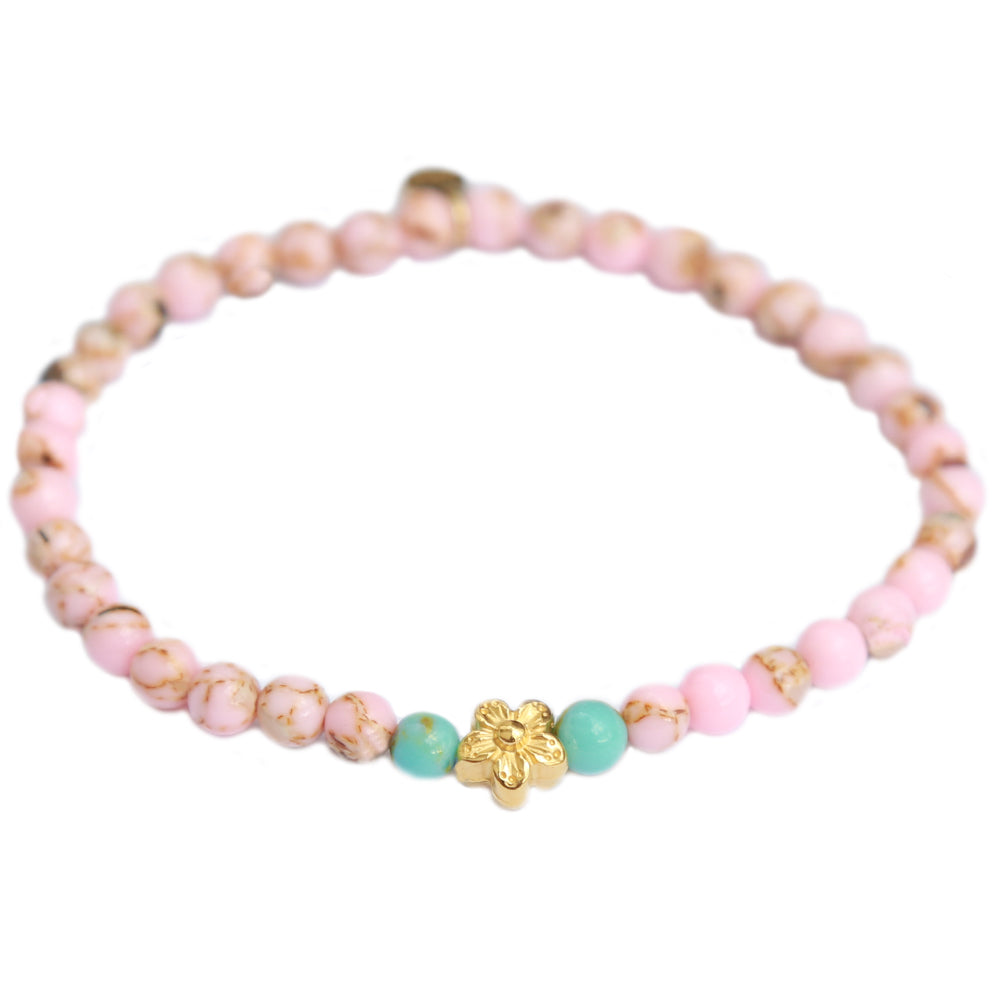 Leuke roze met turquoise armband en een klein goud bloemenkraaltje!