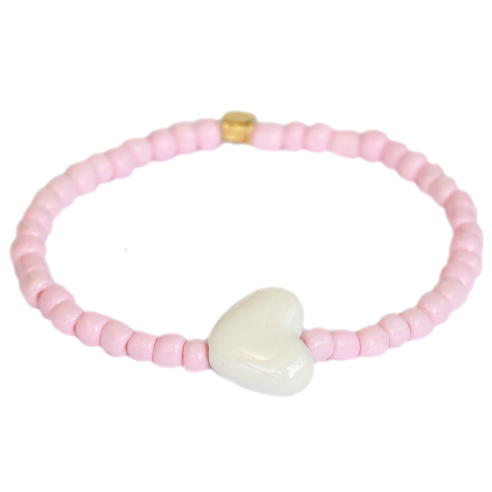 Mooie roze kralen armband met een keramieke hartjes bedel! Het armbandje is gemaakt met elastiek.