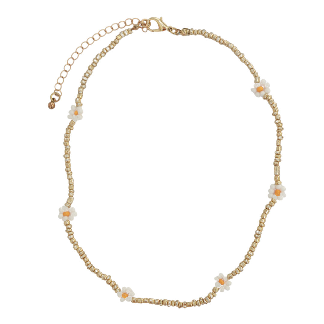 Oopsy daisy ❀ Super cute choker kettinkje van gouden kraaltjes met madeliefjes.Lengte: 40-45 cmMateriaal: Parelkraaltjes, gold plated