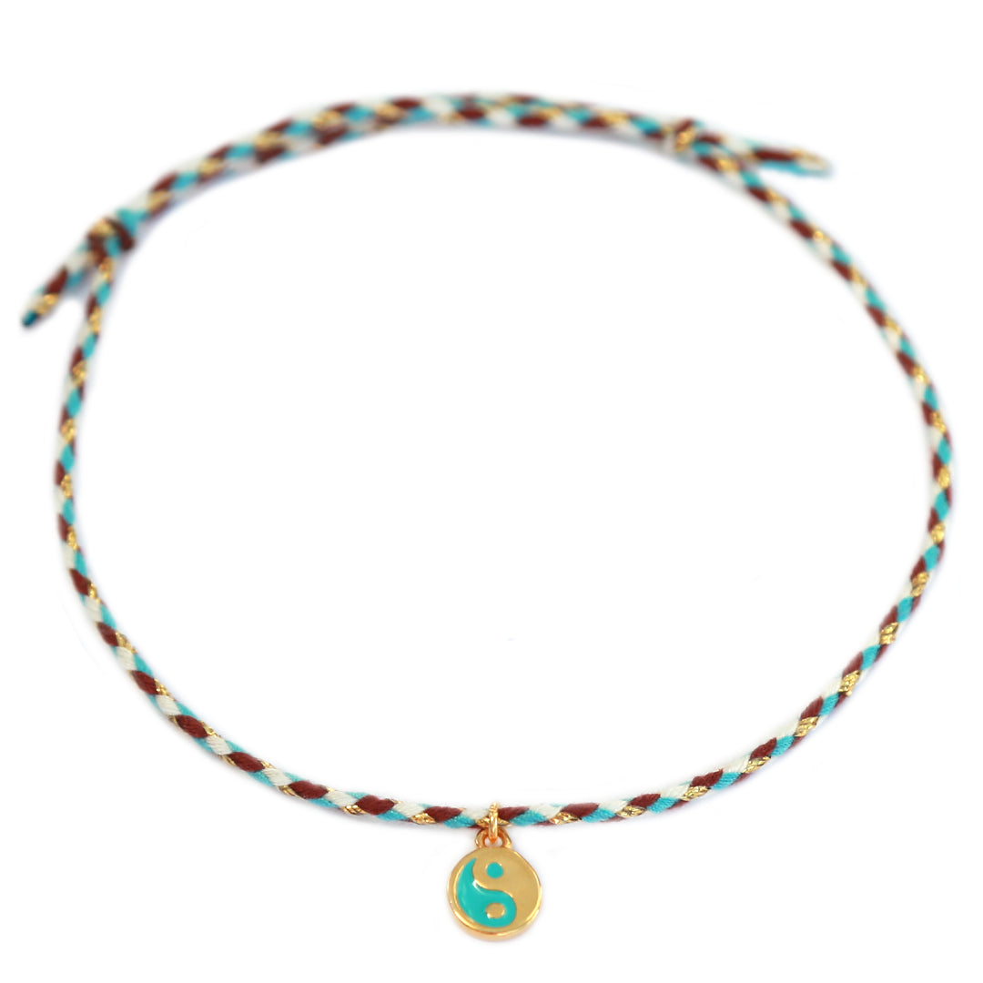 Fijn enkelbandje van gekleurd draad met een kleine goud en turquoise yin yang bedel.