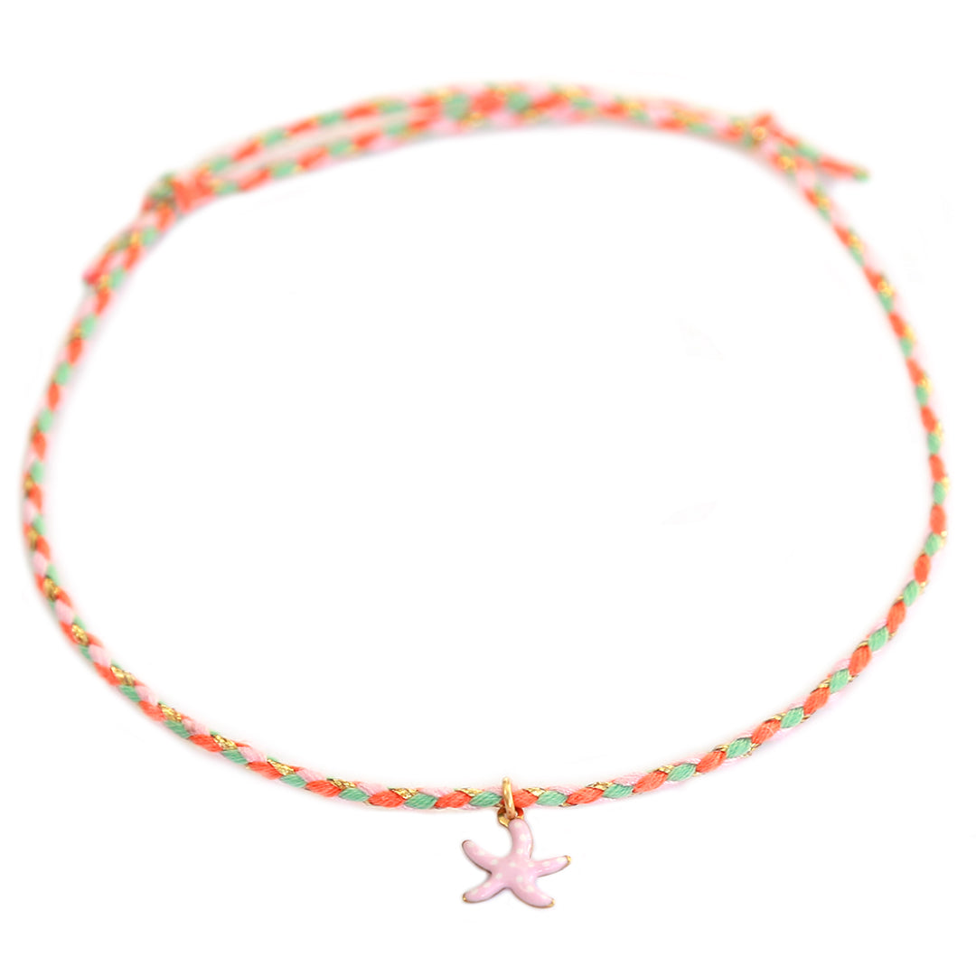 Fijn enkelbandje van gekleurd draad met een kleine roze zeester bedel.