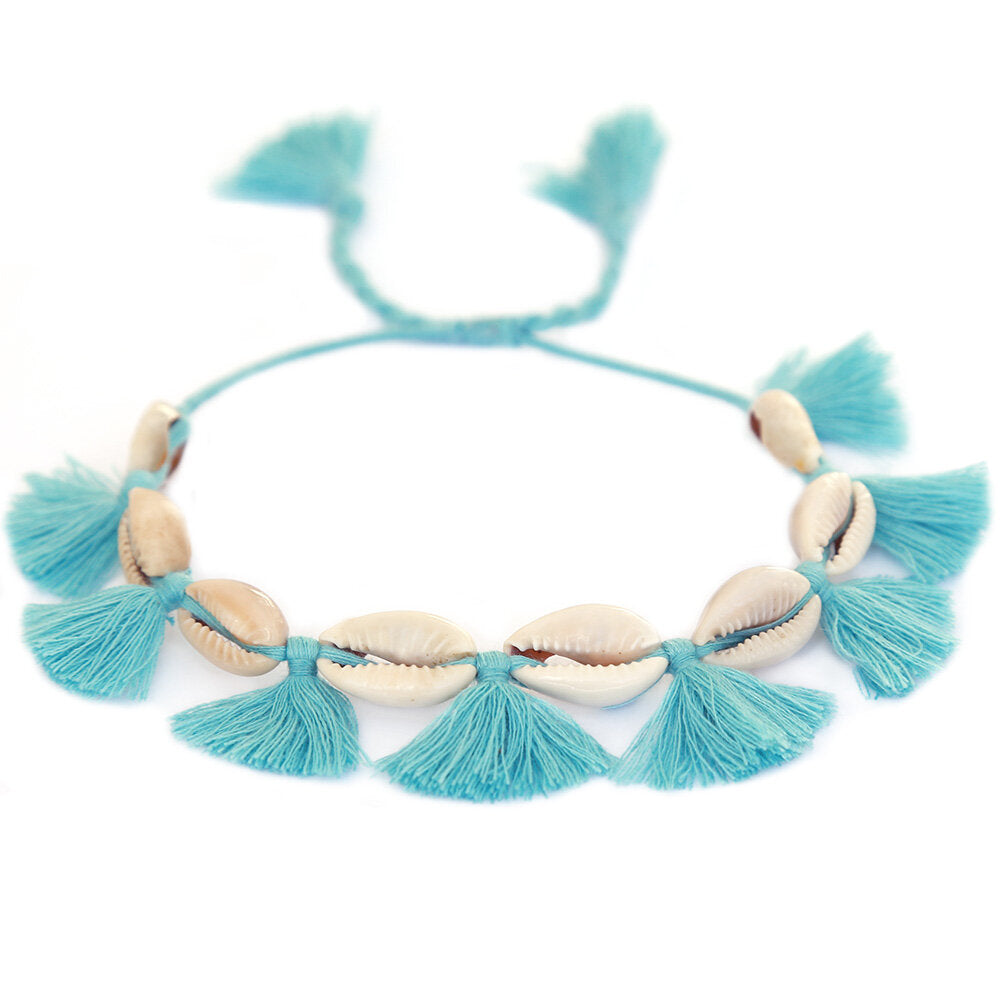Speels enkelbandje met schelpjes die afgewisseld worden met kwastjes.