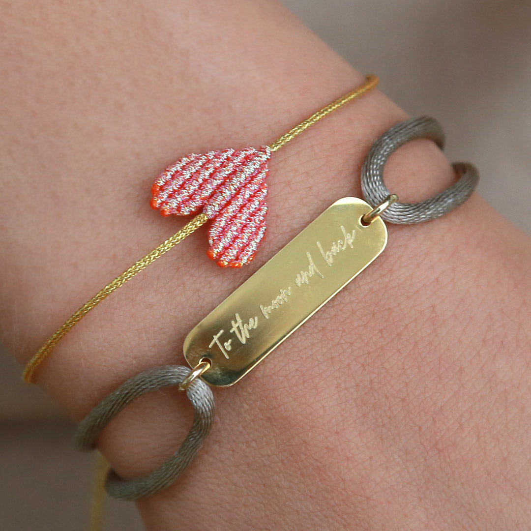 Gegraveerd armbandje met de tekst 'I love you' en 'to the moon and back'. Ook mogelijk in het zilver en een kleur bandje naar keuze.