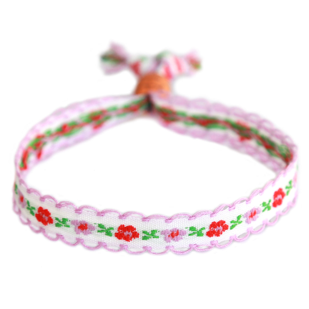 Leuk geweven armbandje met een bloemenprintje. Je kunt het armbandje makkelijk op maat schuiven met het schuifkraaltje.