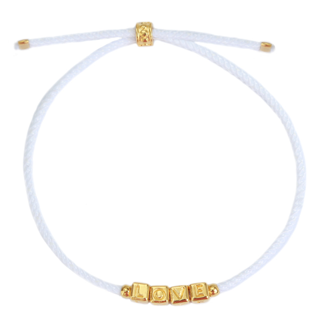 Leuk handgemaakt armbandje met gouden LOVE bedeltjes en wit koord.