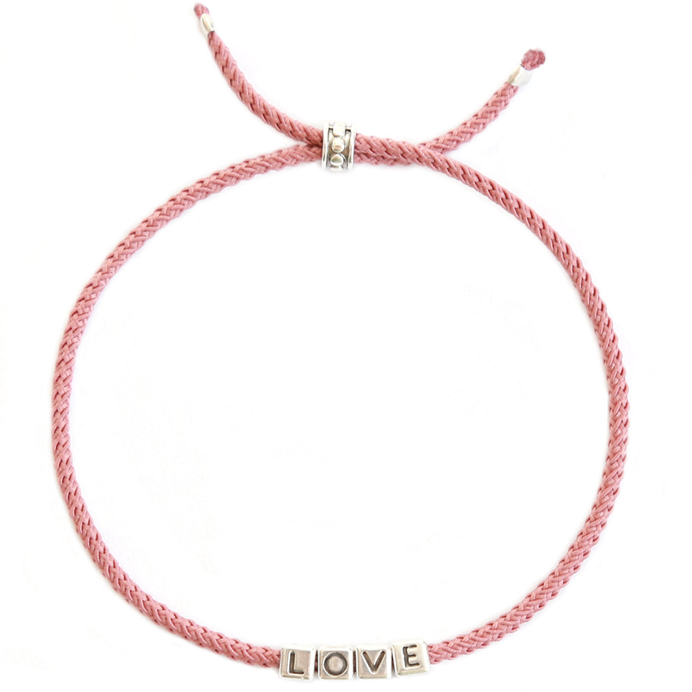 Leuk handgemaakt armbandje met zilveren LOVE bedeltjes en roze koord.