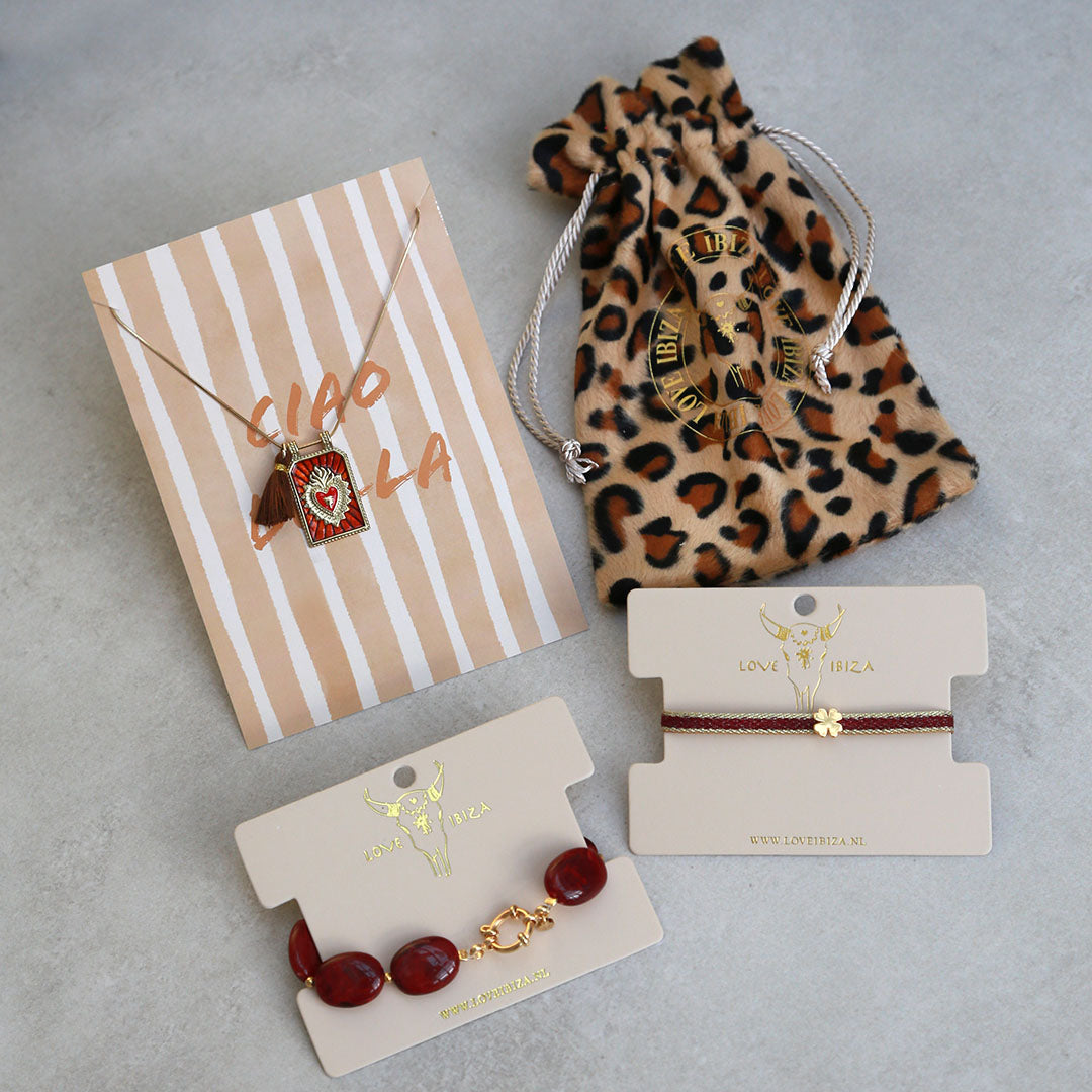 Een burgundy setje met twee armbandjes, een ketting met een kaartje en een mooie gift bag. Dit cadeau setje heeft een leuke set prijs!