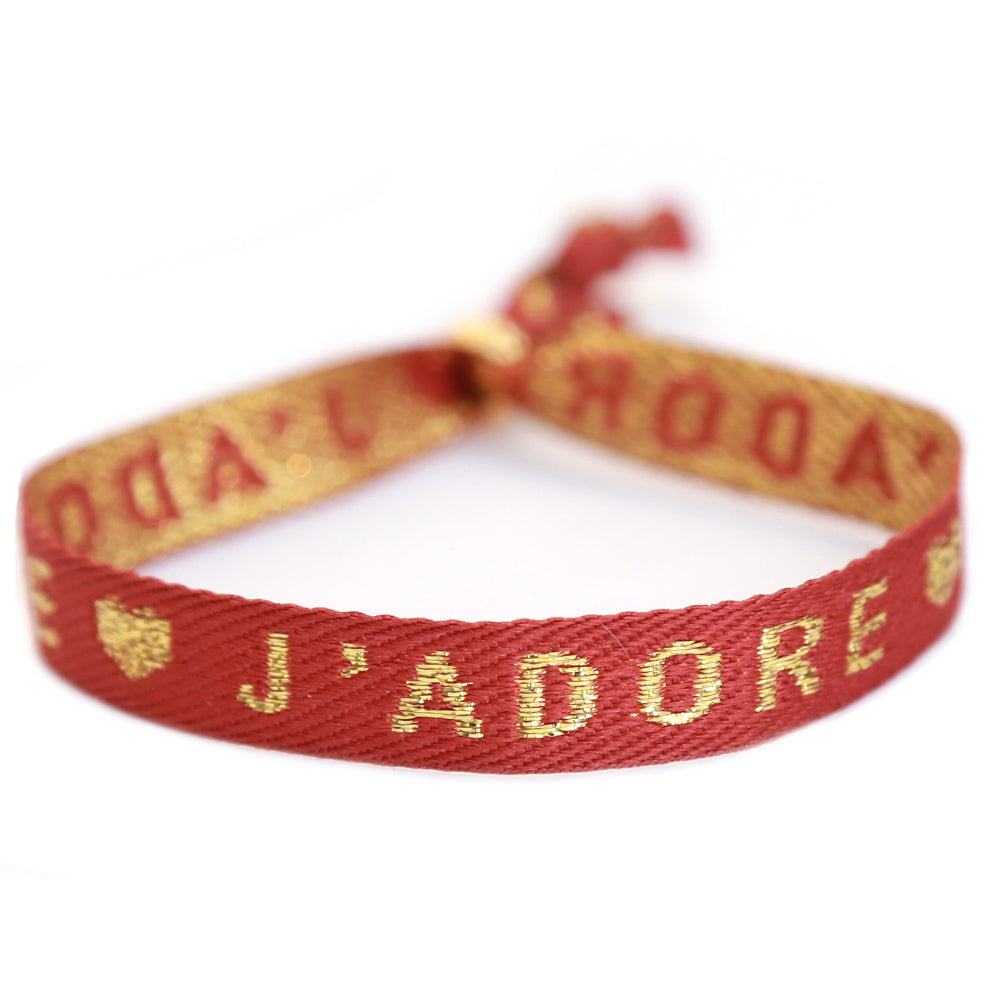Preciosa pulsera tejida en rojo y dorado con el texto "j'adore".