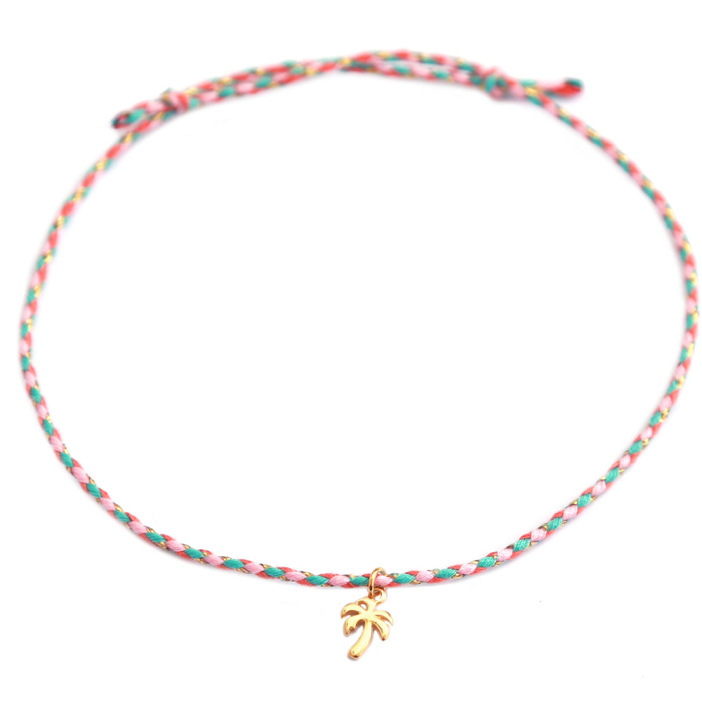 Bonita tobillera de cordón trenzado en colores veraniegos y con un dije dorado en forma de palmera.